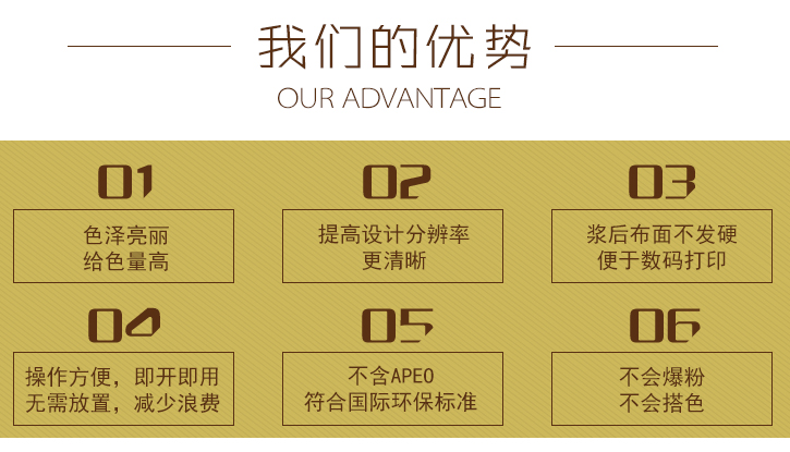 第一個數碼印花技術問題--圖案鮮豔度不夠好,滲色嚴重 數碼印花圖案鮮豔度不夠是很多廠家都會遇到的問💑🏾題,特别是顔色混合的越多,灰度就會越高,這時候圖案顔色🧎🏻♀️➡️鮮豔度顯得暗沉無光。其實主要原因還是處在墨水上,織物表面🥑️出現了滲色的現象導緻了鮮豔度不夠,數碼印花的色彩層次過渡好,如果不處理好鮮豔度不夠,這優點也💌難以發揮不💔起來。我們該🙂↕️如何是避免呢?首先我們需要選用能夠提高得色率的助劑,比🔞如數碼印花增色劑--優彩素286,優彩素286-C1等産品,都能提高紡織物的得色率,手感柔軟,明顯的提高了圖案輪廓清晰度、鮮豔度👯🏾♂️和飽滿度,選對助劑,事半功倍😍,問題就能輕松👩🍼解決。