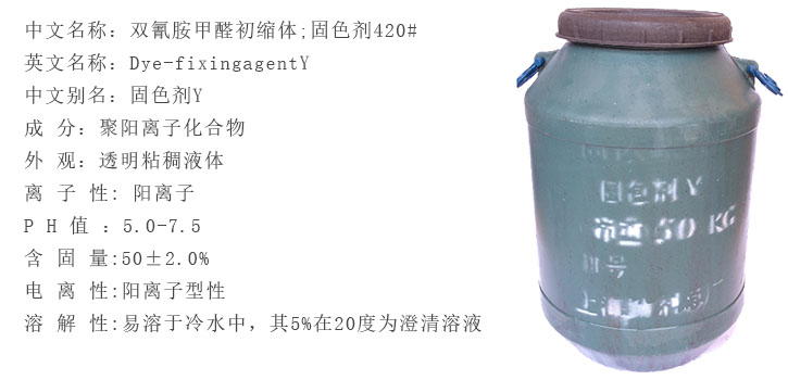 固色劑Y穩定性: 遇硬水、強酸、強堿、丹甯酸、雕白塊以及大量硫酸鹽,次氯酸鹽等會産生沉澱。