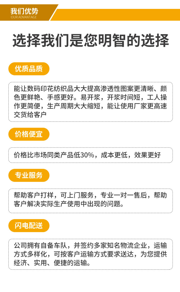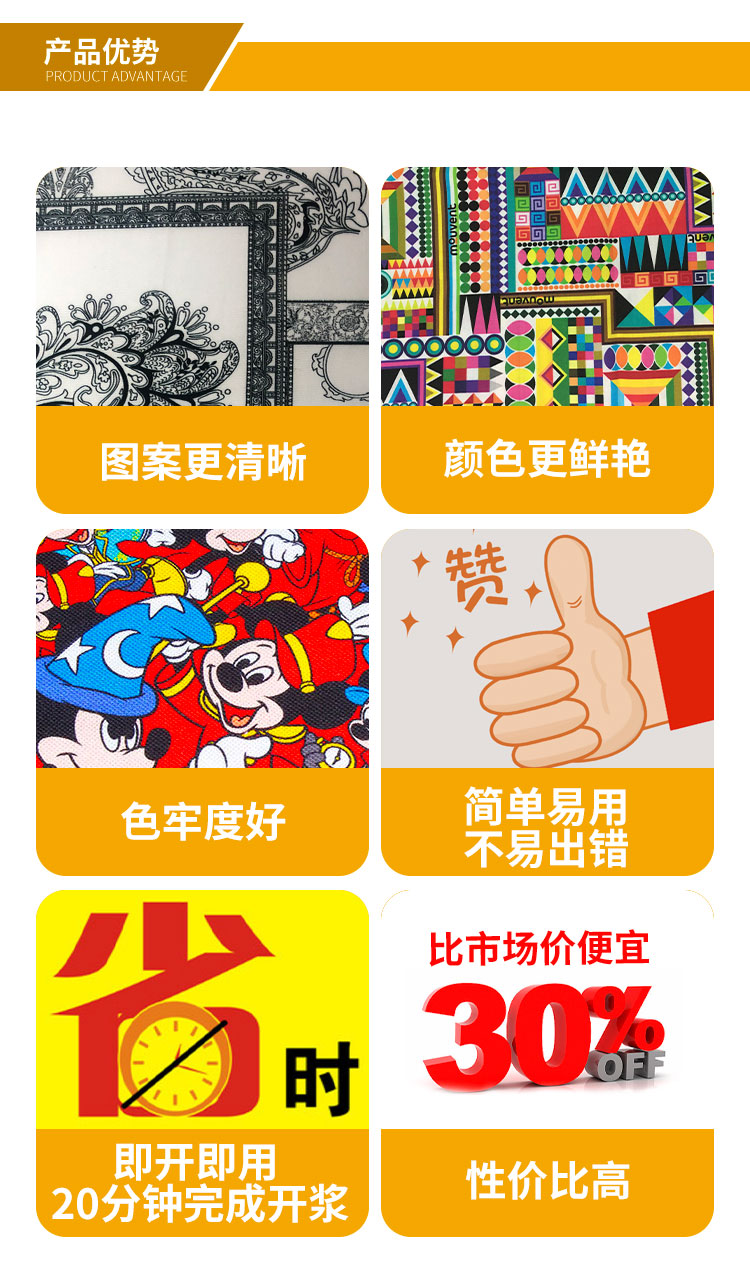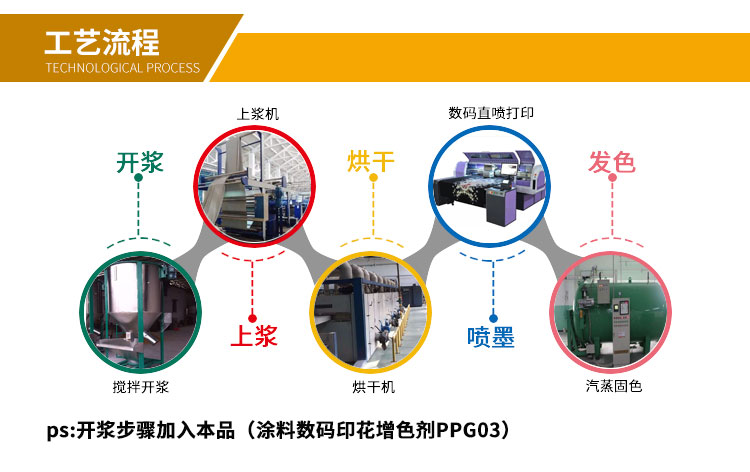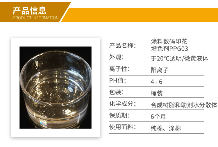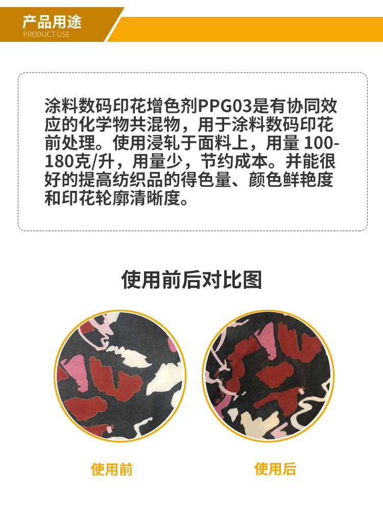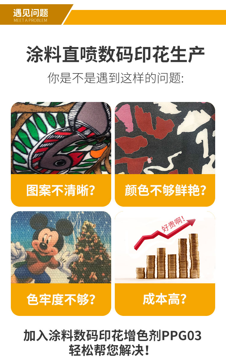 塗料數碼印花增色劑PPG03 使用浸軋于面料上。用量 100- 180 克/升